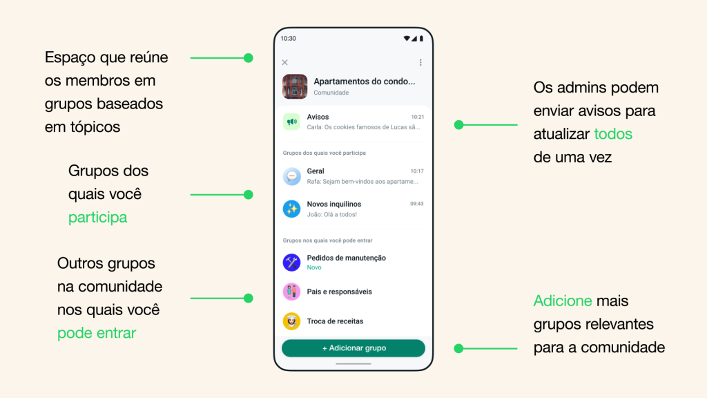 Entre os principais recursos, estão a possibilidade de enviar avisos para todos os grupos ao mesmo tempo, manter a gestão mais organizada e oferecer aos membros uma experiência mais segmentada e focada.